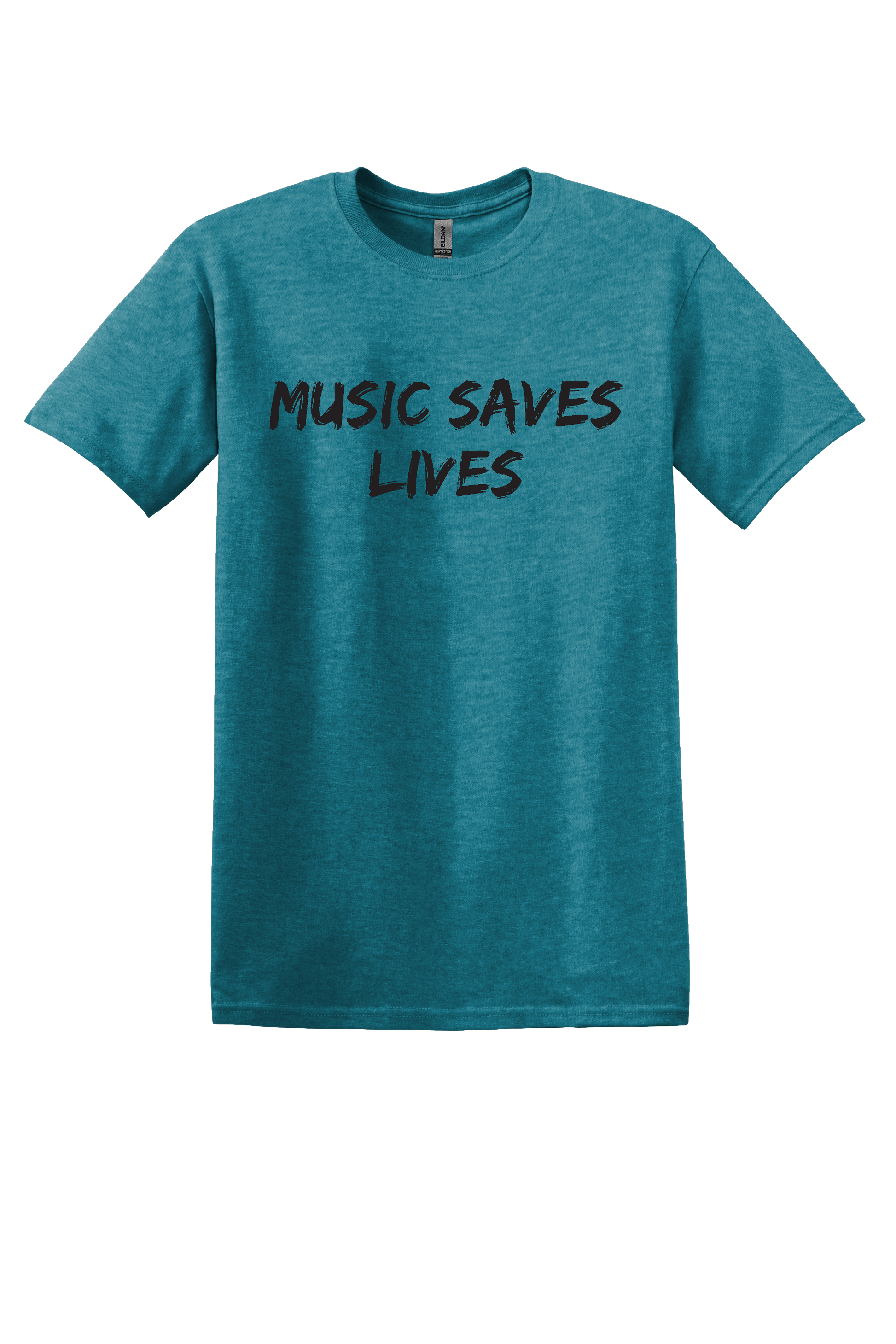 This soft-style Music Saves Lives t-shirt features a back design with the message "End the Stigma," highlighting the importance of mental health with a heartbeat, headphones, and music notes. Twenty percent of every purchase supports the American Foundation for Suicide Prevention.