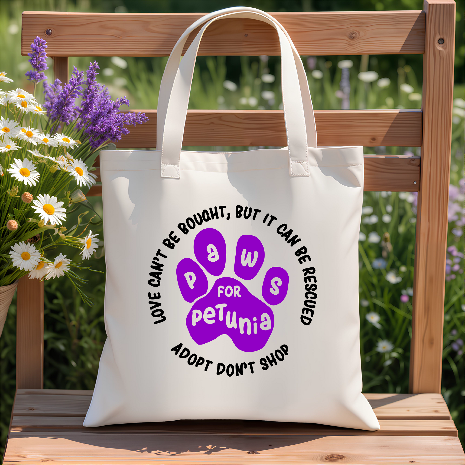 Express your rescue spirit with the Paws for Petunia bundle! It features a screen-printed tote bag and T-shirt, plus your choice of a colorful can cooler and a Dad Hat embroidered with Petunia’s pawprint and the phrase Foster Rescue Adopt. A playful way to show your support!