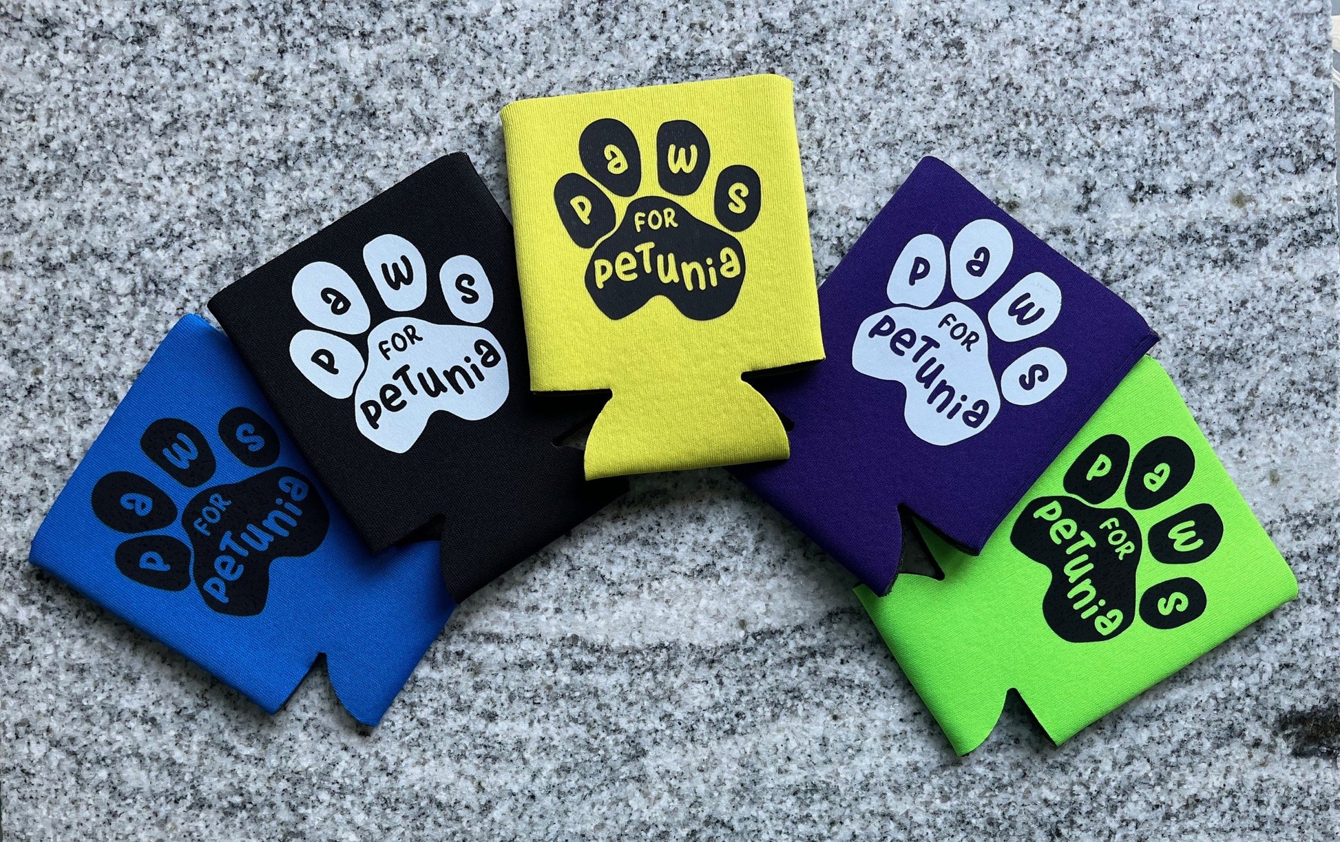 Keep your 12 oz cans cool and your heart warm with this fun can cooler—sporting "Paws for Petunia" on one side and the playful reminder to "Rescue Foster Adopt" on the other!